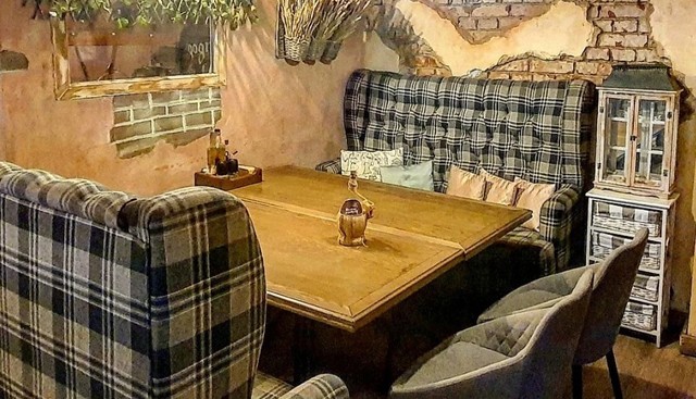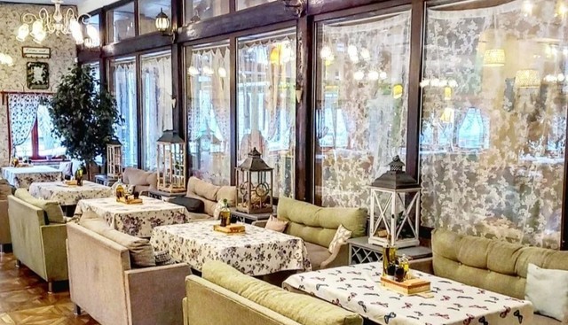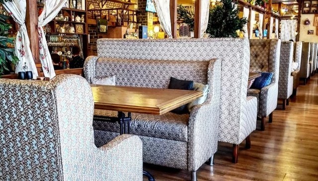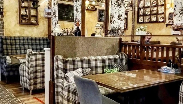 Дизайнер постарался и создал уютный интерьер с интересными элементами декора: мягкие узорчатые и клетчатые диванчики, вязанные абажуры и элегантные люстры над столиками, деревянные полочки с расписной посудой, картины и плетенные корзинки с сухоцветами на стенах, живые растения в горшках.